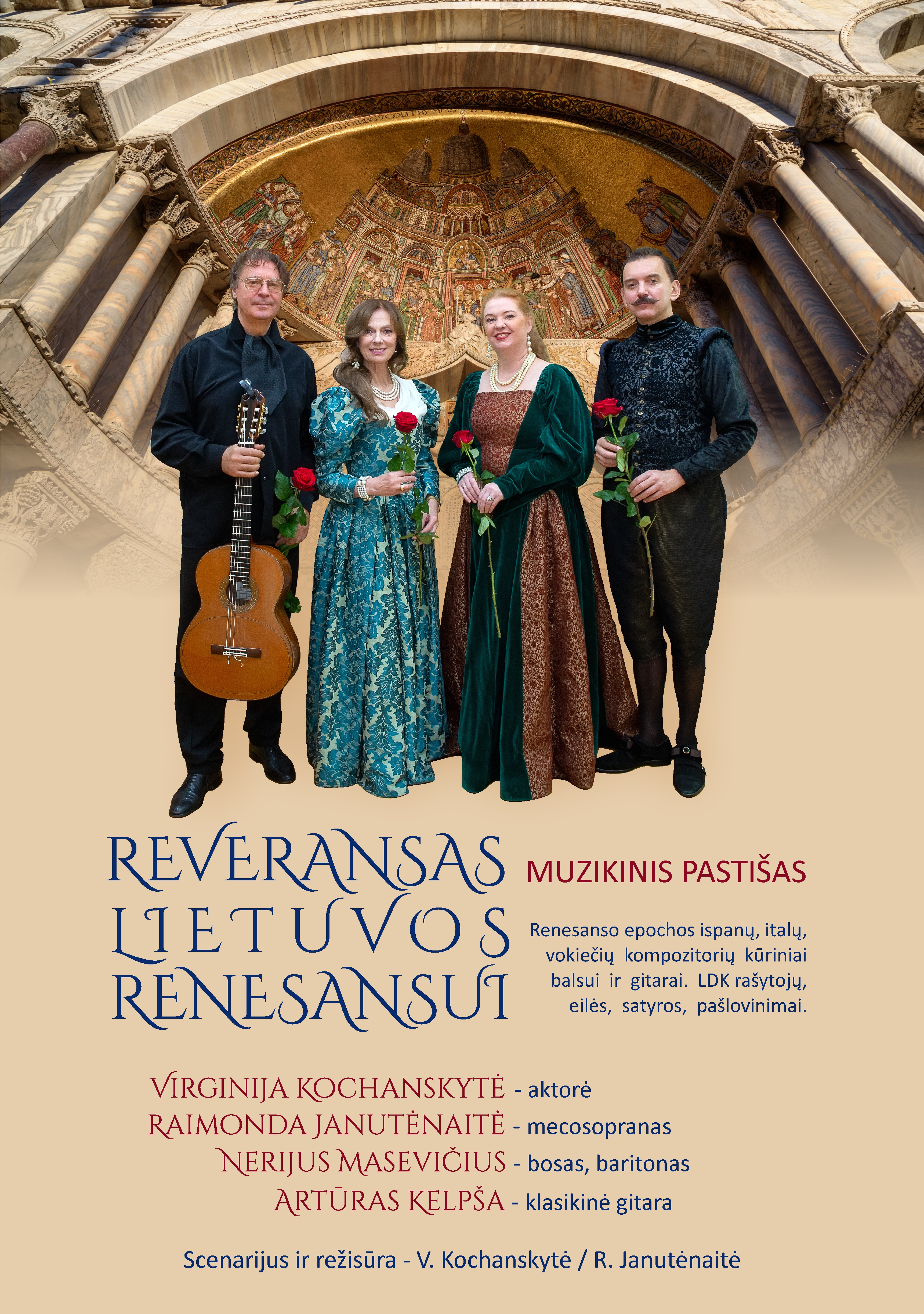Programa „Reveransas Lietuvos renesansui“ kviečia pažvelgti į šį laiką per garsą – per dainas, muziką ir poetinius tekstus, kuriuose atsispindi Renesanso pasaulėjauta. Didikų giminės – Radvilos, Goštautai, Sapiegos – Lietuvos vardą garsino visoje Europoje, o jų aplinkoje menas tapo kasdienio gyvenimo dalimi.